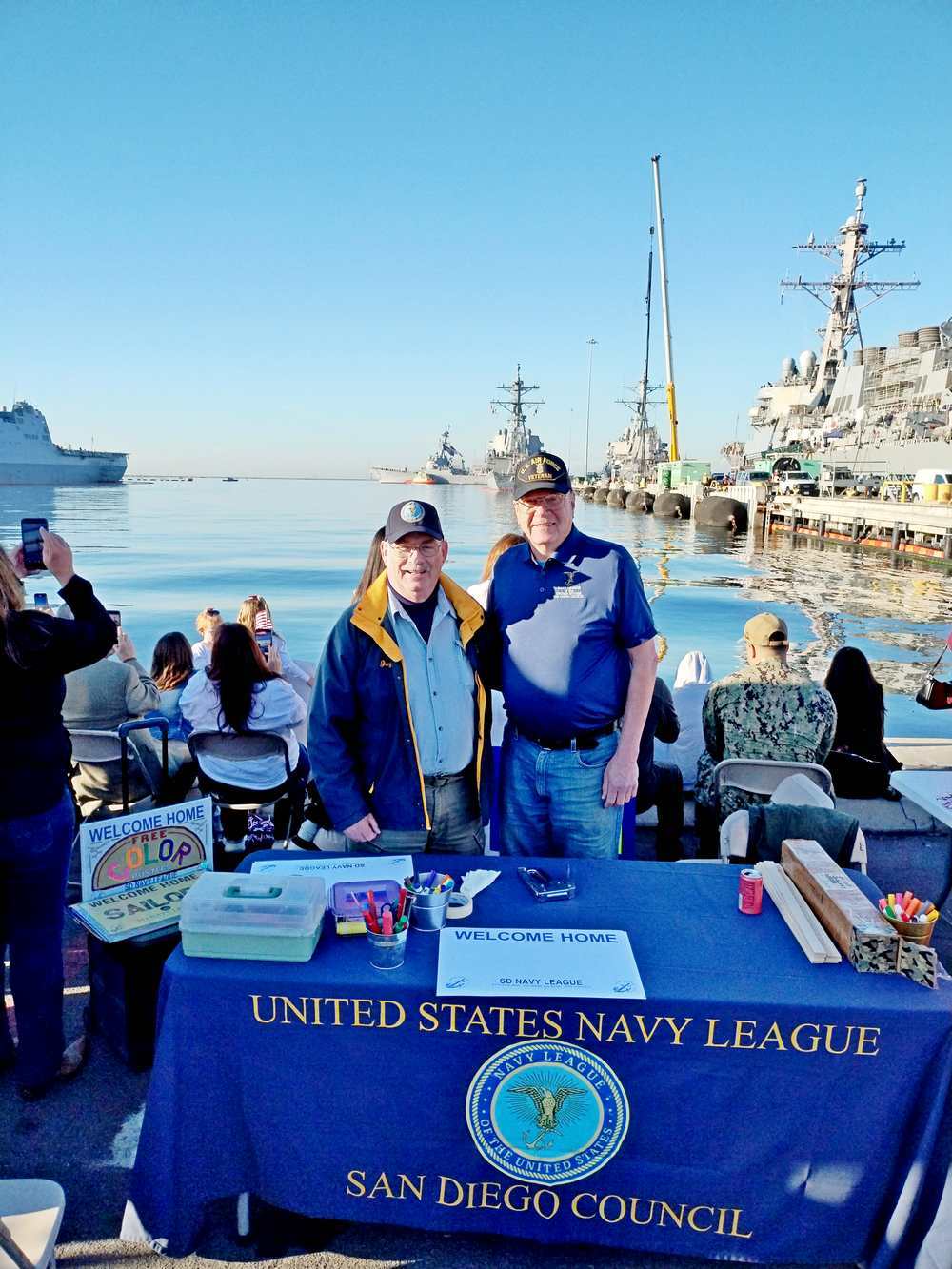 On February 23, 2024 the San Diego Council’s Home Coming Committee joined family and friends in greeting the Sailors and Marines attached to USS CARL VINSON (CVN 70) on its return to homeport from its deployment at Naval Air Station North Island. USS CARL VINSON (CVN-70) is the third Nimitz-class aircraft carrier in the United States Navy. She is homeported at NAS North Island, San Diego, California; she is a member of the United States Pacific Fleet. She is administratively